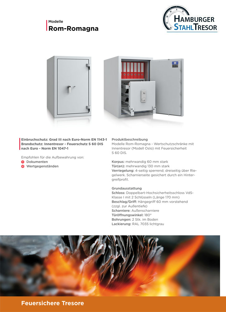 Brandschutz/Feuerschutz von S 60 DIS nach Euro – Norm EN 1047-1 bis zu S 120 DIS nach Euro – Norm EN 1047-1.