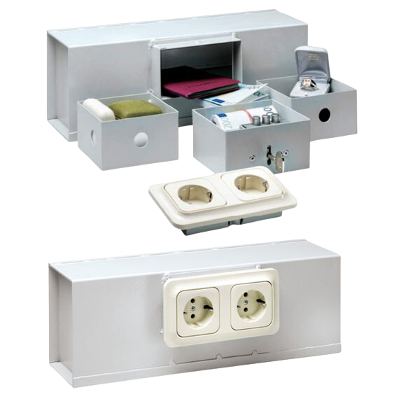 Die Steckdosen-Attrappe ist mit einem Schnappverschluss nach Einbau in der Wand sichtbar.