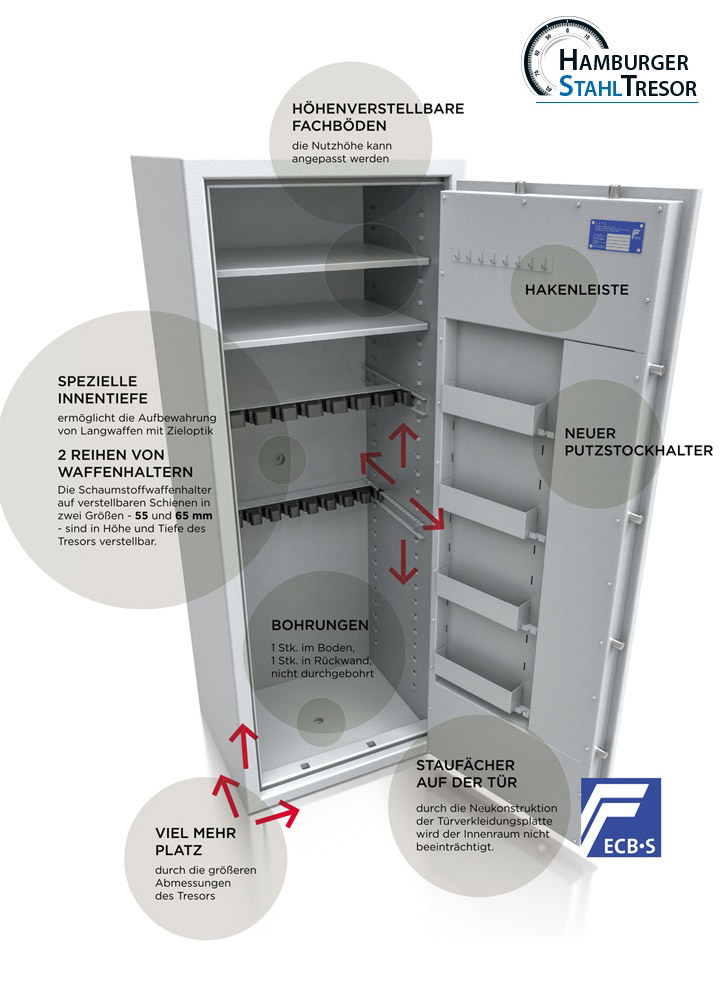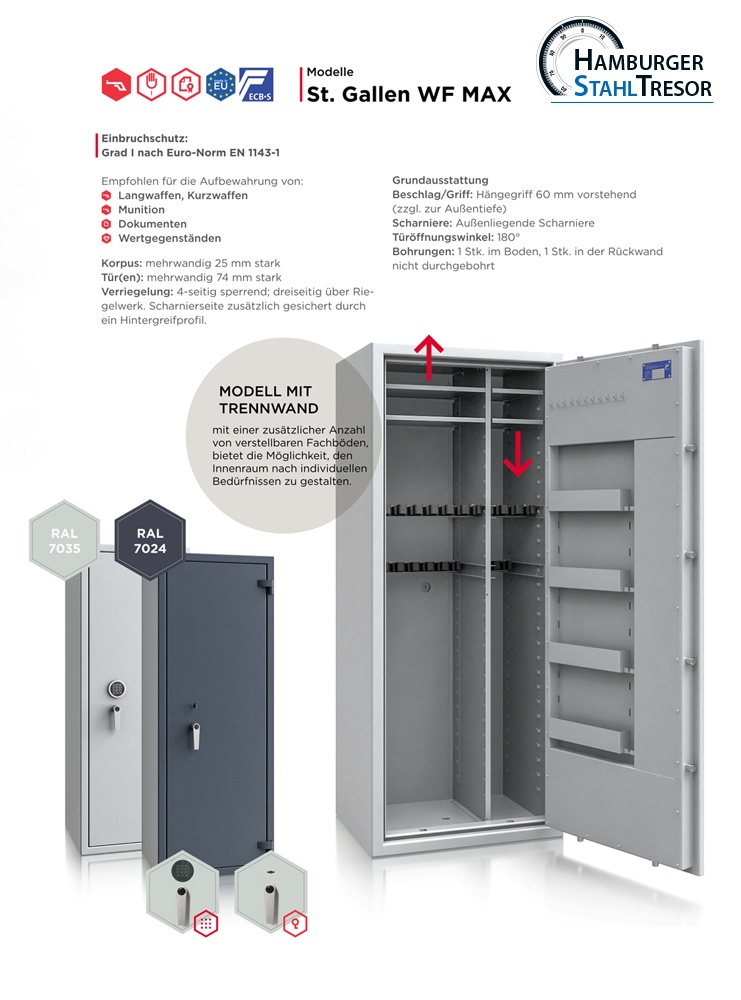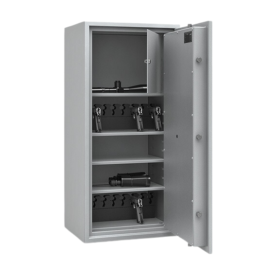Zertifizierte Langwaffenschränke gem. Widerstandsgrad I nach EN 1143-1. Zur gemeinsamen Aufbewahrung von Langwaffen, Kurzwaffen und Munition ohne Höchstmengenbegrenzung.