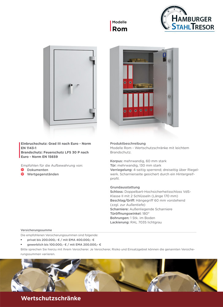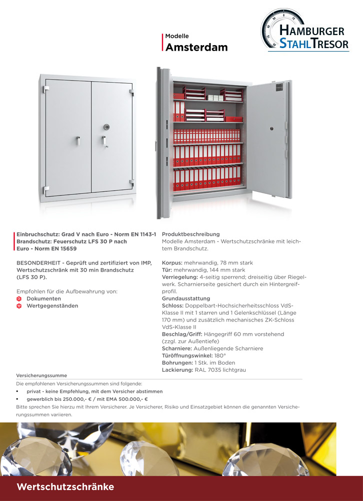 Entscheidend für den Versicherungswert ist, ob der Wertschutztresor gewerblich oder privat verwendet wird und welche Sicherheitsstufe er aufweist. Bevor Sie einen Wertschutztresor kaufen, holen Sie sich Informationen bei Ihrer Versicherung ein! Die mögliche Versicherungssumme richtet sich nach der entsprechenden Sicherheitsstufe Ihres Tresores. Halten Sie dazu Rücksprache mit Ihrem Versicherer.